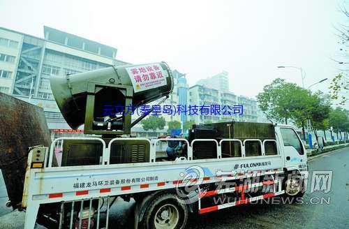 针对近日芜湖的雾霾天气,各区环卫部门加大了洒水降尘的力度,中心城区还用上了新设备——降尘除霾雾炮车(如图)。