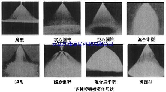 常用喷嘴按喷雾体形状分,可分为空心锥体喷嘴、实心锥体喷嘴、扇形喷嘴等,各种喷嘴的喷雾体形状如图所示。