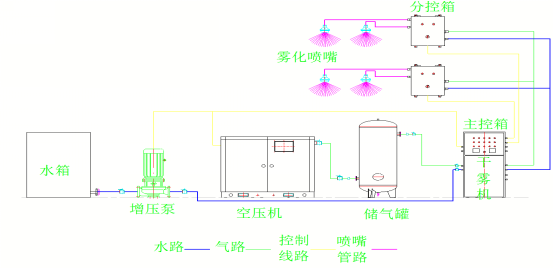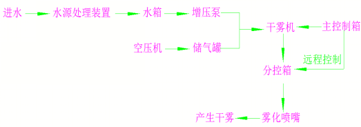 干雾抑尘装置主要组成部分有:干雾机、主控箱、分控箱、水源处理装置、空压机、储气、水管、气管、水箱、增压泵、雾化喷嘴组件和电伴热系统。